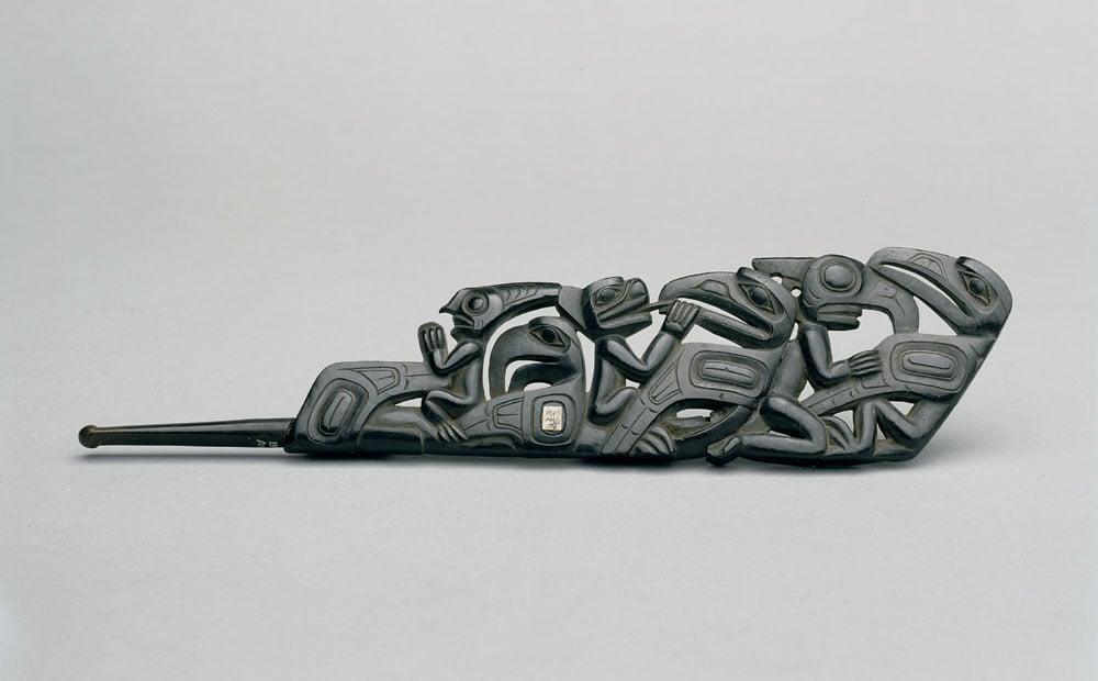Although probably never intended for smoking, this elongated and heavily pierced pipe is elaborately carved with crest figures. Around 1820 the Haida began to carve objects from argillite, a black carbonaceous shale found in the Skidegate Inlet area, which they sold to traders and travelling seamen. The object is one of the eight works attributed to the Haida, one of the indigenous people of British Columbia, acquired by the Art Fund in 1949. It came from Haida Gwaii or the Queen Charlotte Islands, off the coast of Western Canada and was part of a large and varied collection of 30 works of ethnographic art, formed by W. O. Oldman, which the Art Fund presented to the nation on account of its 'exceptional merit'.