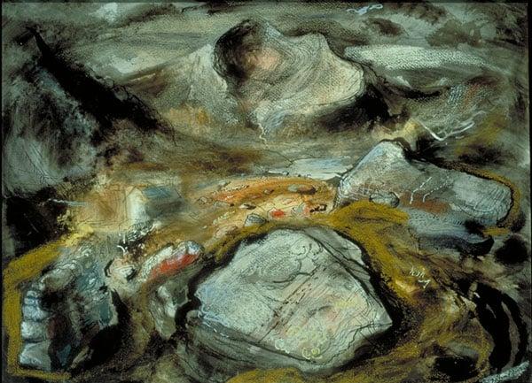 Snowdonia, intensley dramatic and quintessentially Romantic, was magnetic to Piper. In Wales, as in Yorkshire and elsewhere, he was following in the footsteps of the old Romantic artists, in particular Richard Wilson. In Snowdonia, Piper was studying and painting pure landscape devoid of any buildings.