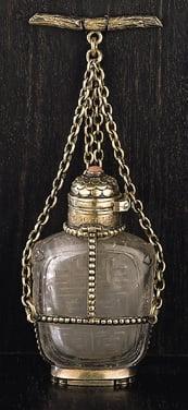 Clear glass bottle mounted on silver gilt retractable feet. Has been adapted with a thin silver gilt band around the neck and body with a chain attached on either side for hanging.