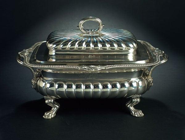 A rectangular George III silver soup tureen and cover resting on four paw feet. The lid is engraved with a scene of Castle Campbell, Dollar. The tureen is engraved with a presentation inscription.