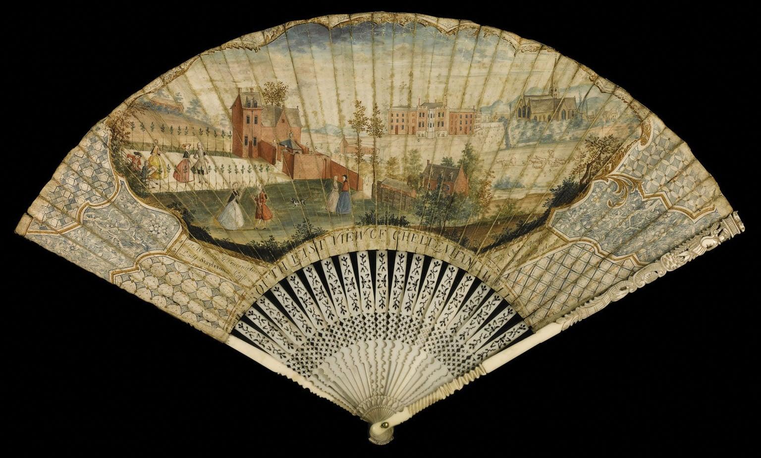 Thomas Robins the Elder was an important 18th-century fan painter and landscape artist. He was born in Cheltenham and lived for much of his life in Charlton Kings on the eastern side of the town. This fan is richly decorated with a view of the South East of the town, and features a number of different annotated elements, including ’The Well and its Conveniences’ , ‘Lady Stapleton’s house’, ‘The Church and part of ye Town’, and ‘…Stapleton’s Dog Kennel’; of these only the Parish Church, St Mary’s, still stands. The mention of Lady Stapleton’s name twice strongly suggests she commissioned the fan. A number of figures are depicted including what is probably the artist himself seated at work on the left of the scene (Robins includes himself in other known work), and Lady Stapleton may also be included as one of the well-dressed figures on the Well Walk, possibly accompanied by her friend Captain Henry Skillicorne, the developer of Cheltenham Spa.