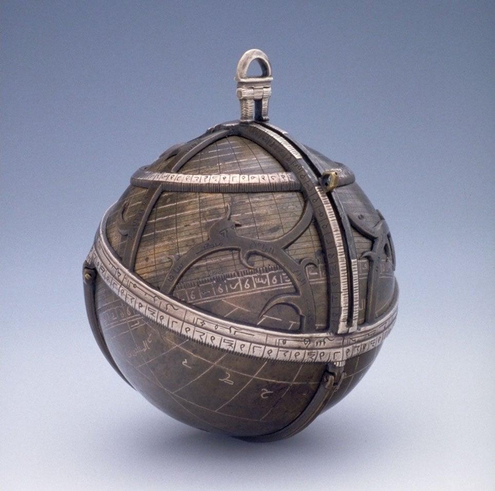 This astrolabe is made of brass with the inscriptions, hour-lines, meridians and circles of altitude in silver; the rotating star map is made of brass, laminated with silver on the ecliptic and equatorial circles. The globe is made of two hemispheres jointed by means of single coarse screw-thread. This instrument was never as popular as its flat counterpart, the planispheric astrolabe, and it is likely a few of them were ever made. This spherical astrolabe is the only complete example of its kind to survive. It was used to make astronomical calculations and is of Eastern Islamic origin. All the inscriptions are in Eastern Kufic Arabic and it is signed 'Work of Musa', Musa standing for an unknown instrument maker.