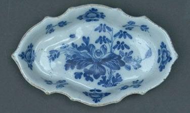 In the mid 18th century tea drinking ritual, the shallow saucers of the day were not able to hold the long- stemmed tea spoons in use. Instead, these were placed in small, flat dishes on the table. Originally referred to as spoon boats, and later as spoon trays, these were in use as early as 1706. This delicately-patterned spoon tray is decorated with a chinoiserie design not previously known to be on any other piece of English glazed tea ware. A bamboo stem in the background is partially obscured by a lotus flower with outspread veined leaves. The motif is echoed in smaller blossoms which run around its sinuous, curving edge. The rococo form suggests that the tray was probably made in a Liverpool factory around 1750-55. Tin-glazed spoon trays from the mid-eighteenth century are scarce, as China was exporting large numbers of hard-paste porcelain examples at comparatively low prices.
