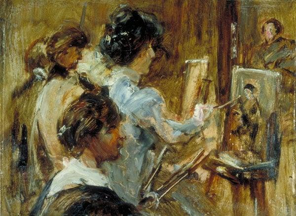 This work is part of the J W Blyth collection of 116 paintings. Mr J.W. Blyth lived in Kirkcaldy and ran a linen mill there. His house was filled with his large art collection and he lent a large number of the paintings to the gallery during his lifetime. He was gallery convener for some time and grandfather to Michael Portillo, former Conservative MP. This painting shows ladies attending a life painting class.
