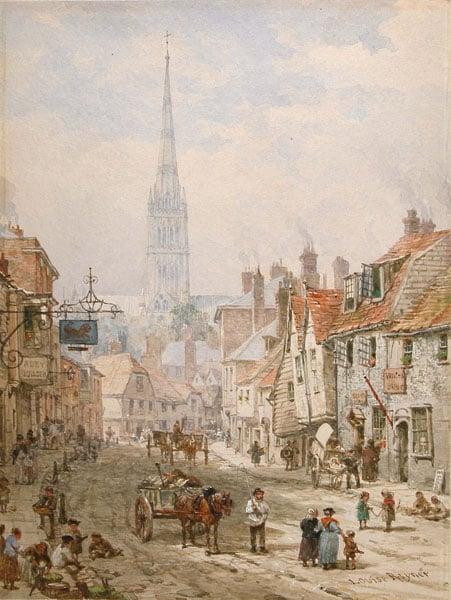 This works shows the street where the Salisbury Museum was situated from 1864-1981 although the museum itself is just out of the picture. With the focal point of the Cathedral, it is an accurate reflection of St Ann Street at the time and the oriel window on the left is still there today. The street used to be one of the main thoroughfares in the city but now has a much quieter, more residential aspect.