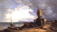 The two windmills at Bel Royal are in St. Aubin's Bay on the south coast of Jersey. The windmills were demolished shortly after Webb had painted them.