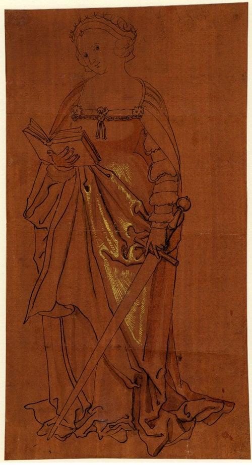 A standing female saint, possibly St Catherine holding a sword and an open book. One of a group of drawings selected from the collection of the late Francis William Smith.