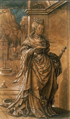 St. Catherine standing in front of an architectural niche, a town square with a fountain and hills in the background. This is one of 111 drawings bequeathed to the British Museum by Rosi Schilling in 1997. The majority of this collection of drawings formed by Dr Edmund Schilling was bequeathed to the British Museum through the Art Fund by his widow, Mrs Rosi Schilling, in 1993. Schilling was a former curator of the Stadelsches Kunstinstitut in Frankfurt, who emigrated to England in 1937. He was one of the few acknowledged specialists in this country on German graphic art, and built up his collection during the 1940s and 1950s in London when, Northern drawings were unfashionable and could be bought relatively inexpensively.