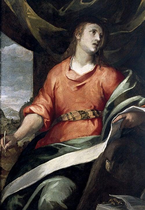 Saint John sits with his head turned towards the top right corner of the painting. He sits before a column which is draped by a curtain and a scroll runs diagonally across Saint John's robe. The saint is identifiable by his iconographical attribute, the eagle, on the right. This painting was part of a collection of 117 works belonging to the industrialist and engineer F.D. Lycett Green and bequeathed to York through the Art Fund, in 1955, in recognition of the remarkable efforts made after the Second World War by its curator to transform it into a gallery of international importance.
