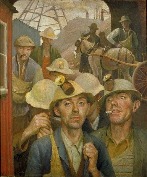 The tin miners are depicted coming off the late shift, and two are identifiable portraits. The work typifies Harvey's late realist style. Its industrial subject matter, that of tin mining, was one seldom dealt with by other major Cornish artists, despite its importance to the economic life of the region.