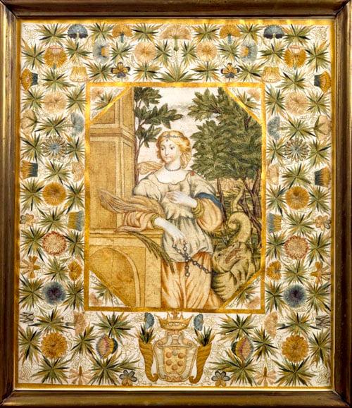 The centre panel outlined by a strip of gilded vellum shows Saint Margaret with her attributes, set in an Italian landscape. The work is laid on vellum.