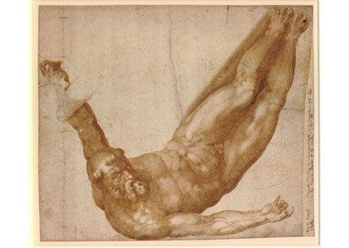 Copy after the figure of the crucified Saint Peter from Michelangelo's fresco in the Vatican's Pauline Chapel. This work is part of a collection of 45 works bequeathed by Ison to 10 public collections. Ison was trained as an architect and later became an architectural historian: his passion for classical architecture was reflected in his books on Georgian Buildings of Bath and his work as Architectural editor for the ongoing series 'Survey of London' which he worked on between 1957 and 1970.