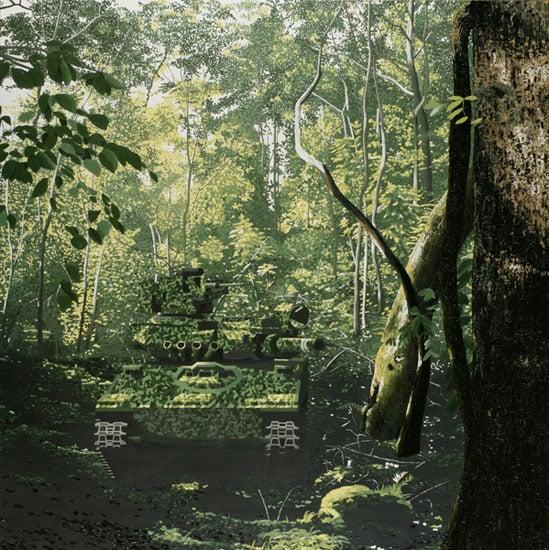 This work depicts a tank emerging from a sunlit forest glade. The functional form of the tank is disguised by the machine’s camouflage – the natural forms and colours of nature have been appropriated by a machine as a form of concealment. Snell uses different techniques to paint the landscape and the tank to create a highly illusionistic painting. Snell’s interest in military machinery began whilst she was a student living and working in Norwich. The number of British and American military establishments in the East Anglia means that such sights are not uncommon.