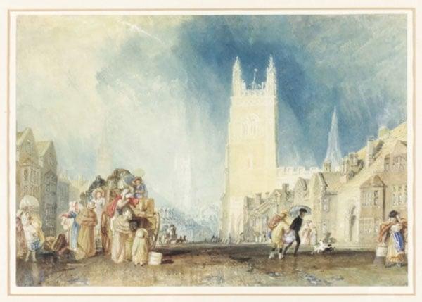 View looks north down High Street with the tower of Saint Martins church in sunlight against storm clouds. Figures in foreground.