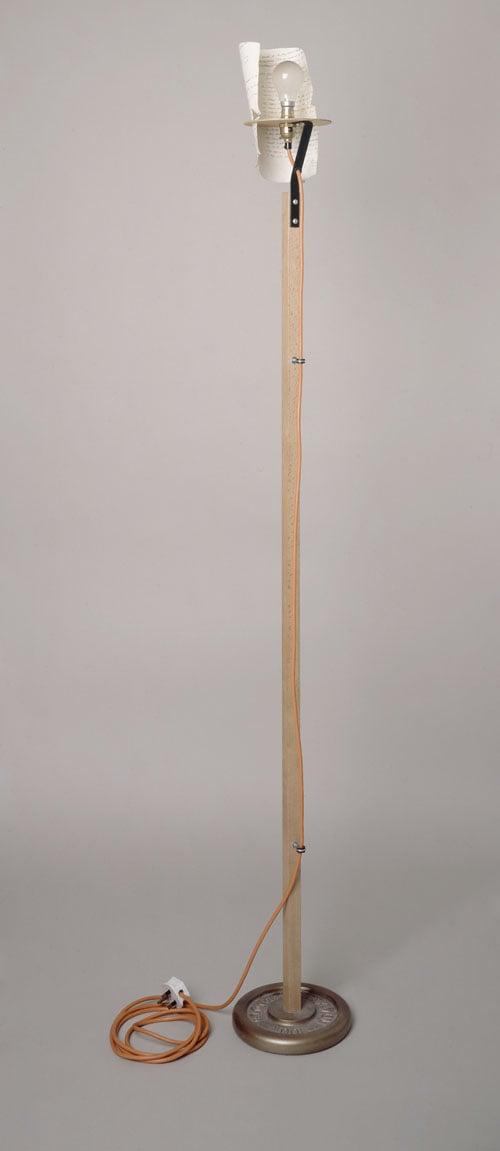 There is something almost philosophical about Michael Marriott's lamps, as though Wittgenstein had gone shopping for timber and electrical components. The shades are the one quirky feature: for the standard lamp, a sheet torn from an old masonic ledger; for the table lamp, you attach a postcard of your choice to the clothes peg provided. Part of a group of three gifts to five museums by Marina Vaizey through the Art Fund between 1995 and 2003.