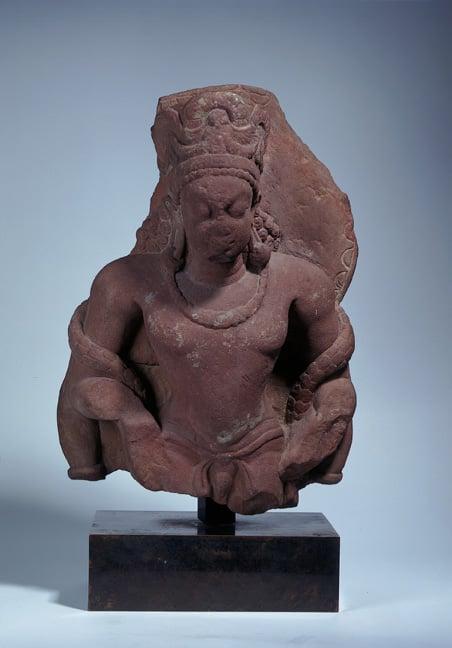 In this fragmentary image the god Vishnu, Preserver and Protector of the Universe, is represented as a youthful and physically powerful princely figure with long curling hair. He wears a high, ornate crown formed with rosettes linked by looped swags, as well as heavy earrings, a necklace, a thick garland swathed round the upper arms, and a lower garment tied at the waist. His nimbus and two additional arms proclaim his divine nature. The four hands and the distinguishing attributes which they held are now missing. This iconography of Vishnu had developed during the Kushan period in the early centuries AD. As with other Hindu and Buddhist icons, it came to full expressive maturity in the great age of the Guptas, which saw an unrivalled flowering of the arts in India.