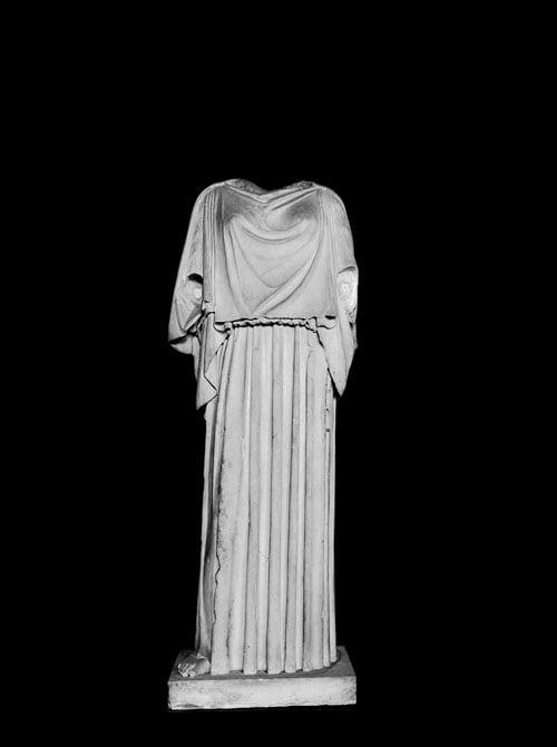 Full-length statue of an Athenian lady. The marble is Pentelic, the arms are restored and the head, though replaced, belongs to the statue. The figure wears a Dorian peplos over a fine chiton with sleeves. It appears to be the school of Pheidias.