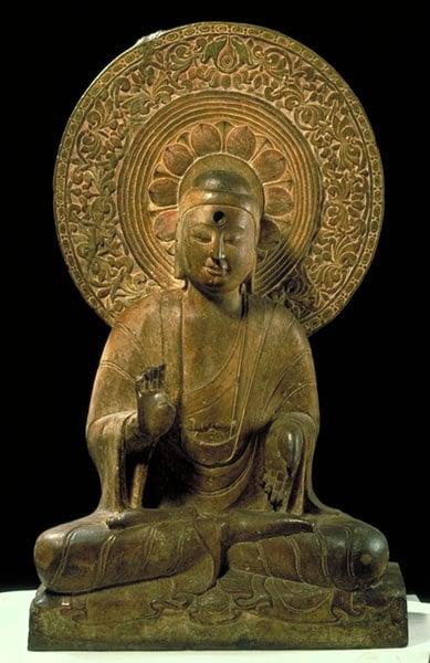 T'ang dynasty. Carved from single block of grey limestone. Paint over gesso (red, green, yellow, blue). Closely related to that in the Freer collection, Washington and in the Peters collection, New York.