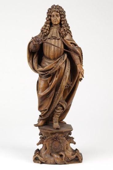 Statuette of a man in armour holding a scroll and sword. The base has sea horses and acanthus leaves. Possibly James II.
