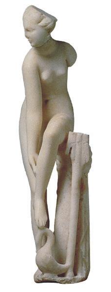 Aphrodite preparing for her bath. Full figure bending to remove the sandal from her left foot.