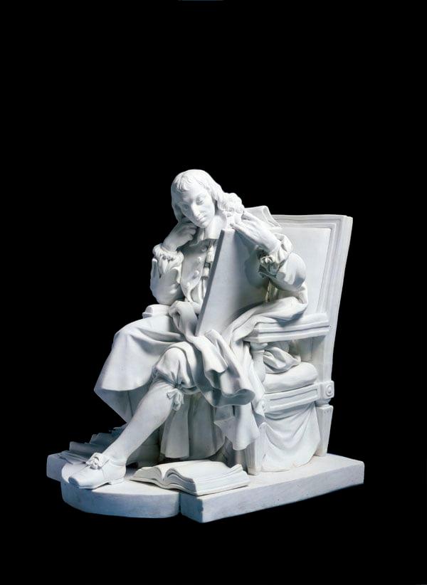 Statuette of Blaise Pascal (1623- 1662) after a terracotta by Augustin Pajou (1730-1809). Pascal is shown as a scientist contemplating a diagram of cycloid on his tablet, rather than as a theologian. A series of statues of Grands Hommes de France was commissioned by the Cote d'Angiviller, Directeur des Batiments du Roi, in 1776. Prior to their execution in marble, terracotta models were made and from these, versions in biscuit for sale.