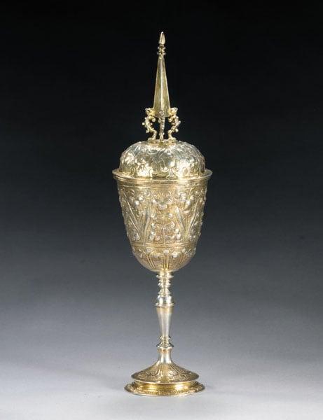 Steeple cups are a uniquely English type of object, found only during the Elizabethan and early Stuart period. The maker of this cup is known only by his mark of the conjoined initials CB.