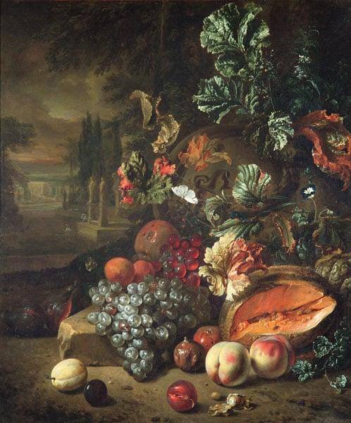 Still Life with foliage and fruit, and landscape background. In a carved Kneller frame.
