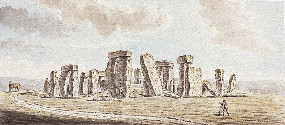 Watercolour depicting Stonehenge with a small figure to the left and another in the foreground.