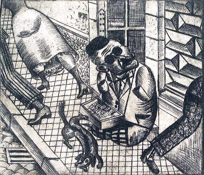 A wall decorator by trade, the Dresden-trained artist Otto Dix was initially enthusiastic about the First World War, enlisting to take part in a conflict that he saw as a necessary cleansing of the old order. Serving on the front line exposed Dix to the brutal reality of war, and by his return to Germany Dix's views had shifted radically. Returning to Dresden, Dix and his mentor Conrad Felixmüller cofounded the Sezession Gruppe, a short-lived collaboration of German Expressionist artists producing works that captured the atmosphere of disillusionment in Weimar Germany and emphasised achieving political change through pacifistic means. Streichholzhandler, a rare proof from Dix's time in the Sezession, depicts a maimed war veteran selling matches on the street, ignored by passers-by and urinated on by a grinning dachshund. New Walk Museum and Art Gallery hosts Britain's largest holding of German Expressionist works, and Streichholzhandler joins the collection for the new display 'Expressionism: The Total Artwork'.