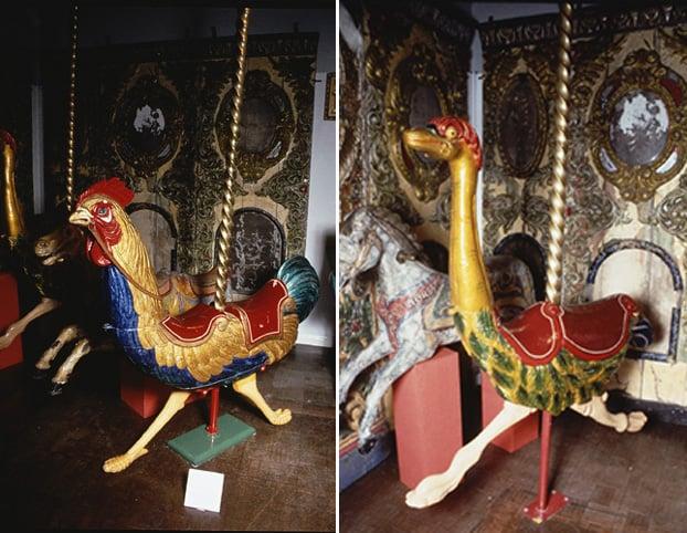 Two carved and painted animals from fairground rides; strutting cockerell and galloping ostrich