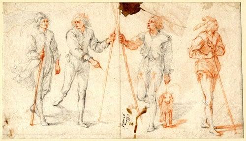 Four youths, each carrying a staff and one of them leading a dog. One of a group of drawings selected from the collection of the late Francis William Smith. Originally attributed to Jacopa da Empoli.