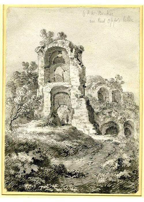 A two sided drawing with one side depicting a ruin with a track leading up to a series of arches on a hillside, the ruins overgrown with trees and bushes (illustrated) and the verso depicting a complex of ruined arched buildings overgrown with bushes on a mound with rocks infront. One of a group of 6 topographical drawings by Edmund Becker presented to the British Museum by Archdeacon F H D Smythe through the Art Fund in 1948.