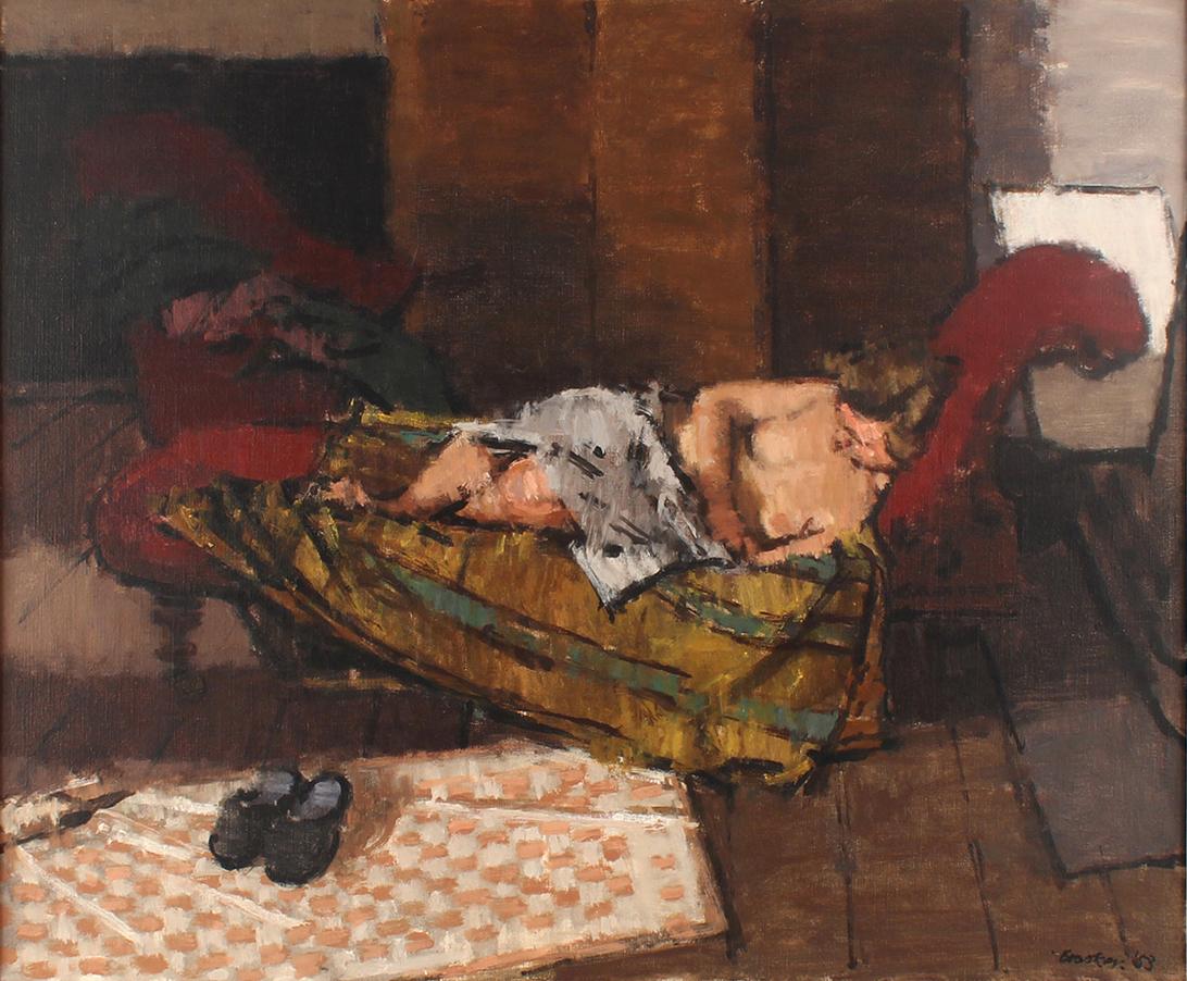 This domestic interior with a nude figure is a fine example of the work of William Brooker, an artist best remembered for his atmospheric figurative paintings as well as for his role as an influential teacher. Brooker trained at prominent art schools, including Chelsea and Goldsmiths, before beginning his teaching career at Bath Academy of Art in 1949. At this time the academy was based at Corsham Court, Wiltshire. Brooker’s style was influenced by the tradition of Walter Sickert and the Camden Town School, as well as by the Post-Impressionism of Edouard Vuillard and Pierre Bonnard. He was also interested in the development of abstract art in Britain, and invited the St Ives abstract painter Terry Frost to teach at Corsham. Among Brooker’s students there was Howard Hodgkin, who remembered him as ‘the only real teacher I ever had’. Chippenham Museum aims to collect specimens and artefacts with local connections, and Corsham Court lies within its collecting area. Brooker’s Studio Interior with Nude now joins the museum as a reflection of the influential role Corsham has played in the development of modern British art.