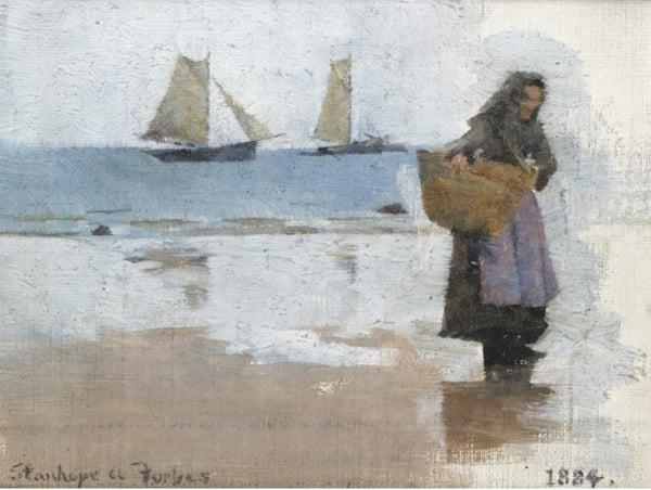 An early preparatory work for the artist's best-known painting, 'Fish Sale on a Cornish Beach' of 1885. This was one of the first paintings made by Forbes after his arrival in the Cornish art colony of Newlyn in January 1884. It has the hallmarks of plein-air, square brush painting that characterised the work of the core Newlyn artists. He wrote: anything more beautiful than this beach at low water I never saw...if I can only paint figures against such a background as this shining mirror-like shore...