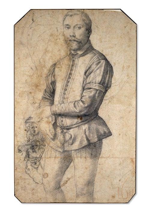 Study for a three quarter length male portrait. No previously known drawing perhaps so strongly evoked the deliberate, impassive, almost sinister coldness of Bronzino's painted portraits. The precise technique, and the arrangement of the folds on the sleeves, anticipate Ingres, as does the masterly subordination of elaborately-studied detail to largeness of conception. Faint chalk lines show that there was to be a background of drapery with an archway on the left.