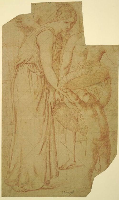 Study for figures in the painting 'Ave Picardia Nutrix' in the Tate. Left, full length draped woman bending, her right hand supporting a naked child, right, standing holding a basket of grapes above its head, behind, right, naked man with a water jar in his right hand. One of nineteen gifts to fifteen museums by Sir Michael Sadler through the Art Fund between 1921 and 1942.