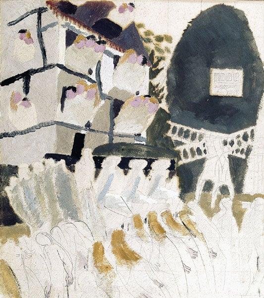 This is one of the final studies for the painting Christ Carrying the Cross, purchased by the Contemporary Art Society for the Tate collection in 1921. The events depicted were inspired by Spencer's memories of Cookham in childhood, when he watched the people pass by in the High Street on Sundays and in the evenings. He used the street as the setting of several of his religious paintings. In this one, the house shown was the artist's home, Fernlea, and the workmen carrying ladders are passing the Nest, the ivy-clad home of his grandmother. Spencer commented that he had made several drawing attempts of the cross and disciples ranged somewhat procession-wise either side of it, some of the soldiers helping in the carrying of the cross, some escorting them. This final study, which is in its original frame, is close in appearance to the finished painting.