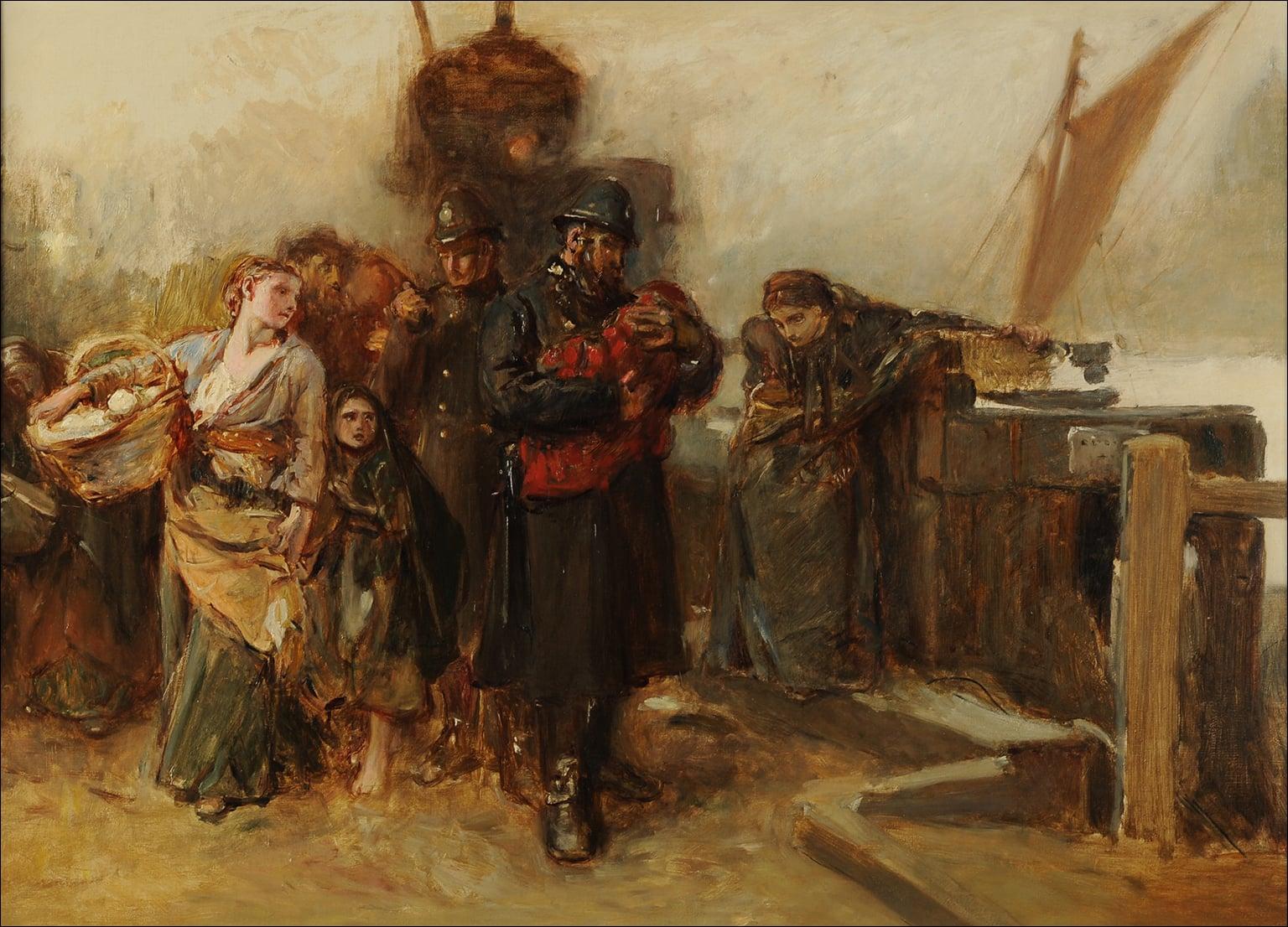 Frank Holl’s moving depiction of a foundling being carried by a policeman has its origins in a true story. The artist was walking around the east London docks one day when he came across a similar scene and used it as inspiration for this picture. Holl, who trained at the Royal Academy Schools, became a leading figure in Victorian art, celebrated for his paintings of rural and urban poverty. In 1870 Queen Victoria commissioned him to paint the hard life of the fishing community in Cullercoats. Later he was known for his portraits of eminent figures, including a memorable likeness of Gladstone. He died in 1888, aged just 43. Holl first turned the story of the abandoned baby into a drawing, published as an engraving in The Graphic magazine in 1873. He heightened the emotion of the original scene by adding the figure of the distraught mother on the right. Among the admirers of the engraving was Van Gogh, who wrote in a letter that it ‘moved me so deeply’. Holl later turned the drawing into a full-scale painting, for which this is the oil sketch. The Mercer Art Gallery recently collaborated with the Watts Gallery in Surrey to stage the first exhibition of Holl’s work since 1889. This Study for Deserted – The Foundling now joins a print of the subject in the Mercer’s collection, alongside a strong collection of work by other Victorian genre painters.