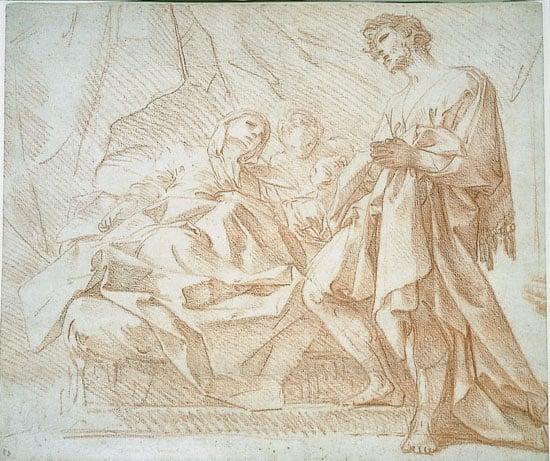 The drawing seems to be a preparatory sketch for Anne and Joachim depicted in the background of the painting by Giaquinto 'Birth of the Virgin' which hangs in the Cathedral of Pisa. Christ Church Picture Gallery has an oil modello of the painting in its collection. Saint Anne and Saint Joachim were the parents of the Virgin Mary.