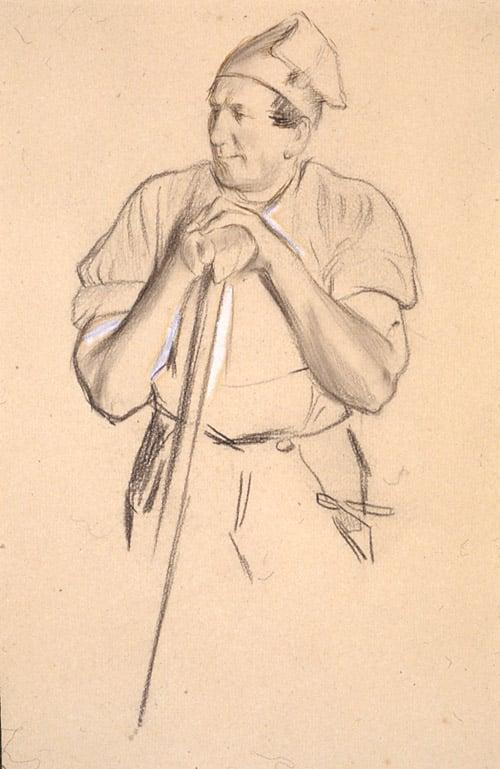 This drawing is a three quarter length pencil study with a study of a Girl in mid-Victorian Dress on the verso. Part of a collection of 9 drawings, 3 etchings and an engraving from the collection of the late Mr J.G. Legge, presented to the Art Fund by his daughter, Miss C. M. Legge, for distribution to four galleries outside London. Mr J G Legge also presented a total of 21 works from his collection to 3 public collections through gifts or bequests.
