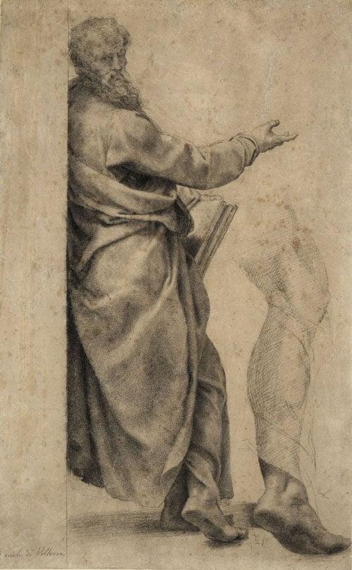 He is seen in profile, leaning against a wall, extending his right arm. To the right is a study of his leg without the drapery. Study for apostle on the left in the fresco 'Assumption of the Virgin' in the della Rovere chapel in Sta. Trinita de' Monti.