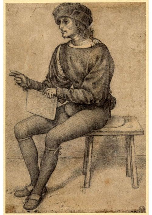 Study of a Seated Youth, black chalk and a little white chalk on yellowish paper, depicting a model in contemporary costume for the figure of St Martin of Tours in the painting in the Palazzo Ducale at Urbino.