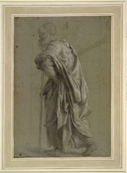 A study for the figure of St. Matthias in the altarpiece of the Virgin and Child with four Saints painted by Lotto in the 1540's for the church of Saint Agostino at Anacona, later transferred to Saint Maria della Piazza.
