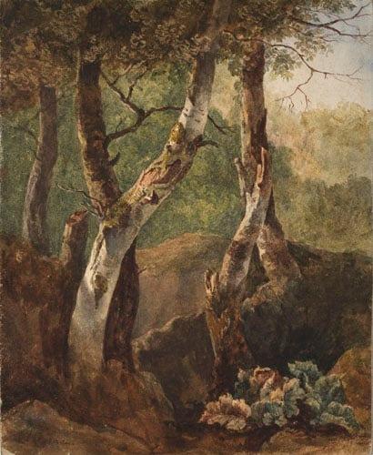 This beautiful little drawing with great depth of colour, depicts a group of birch trees with their silver trunks gleaming against the green of the wood beyond. The pattern formed by the broad leaves of a plant in the foreground is characteristic of Crome's work. The drawing is of particular importance as it bears the signature 'J. Crome', probably the only instance of an authentic signature on one of the works of the artist who founded the Norwich School of Painting.