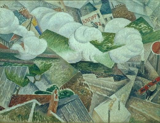 Also known as Train de banlieu arrivant a Paris, 1915. Late work, inscribed and dated on back. Typical Futurist visual vocab for speed - wedge shapes/tilting buildings etc.Painted a year before abandonning Futurism to become an orthodox Cubist.