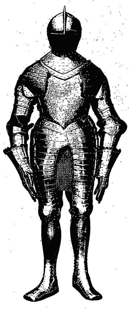 A complete, unrestored suit of armour worn by the King's Champion at the coronation of James II. The ventail of the helmet is pierced with circles; the gauntlets have their original crimson fringes as do the pauldrons and gorget. Made by the Royal Armouries.
