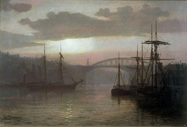 This evening scene depicts the River Wear at Sunderland, looking inland at the road and rail bridges. On the right are the timber yards of Wilson's Sawmills, on the left the Sunderland Glass Company's Panns Bottle Works.