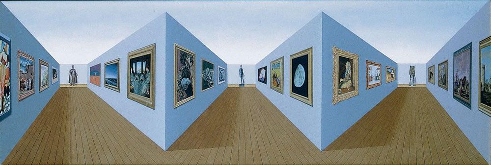 Depicts 23 of the artist's favourite works from the collection of the museum (including three works previously supported by an Art Fund grant), presented as an imaginary exhibition in a three-roomed surreal interior. The three-dimensional structure creates an illusion of depth when viewed from the front, and appears to move as the viewer walks past.