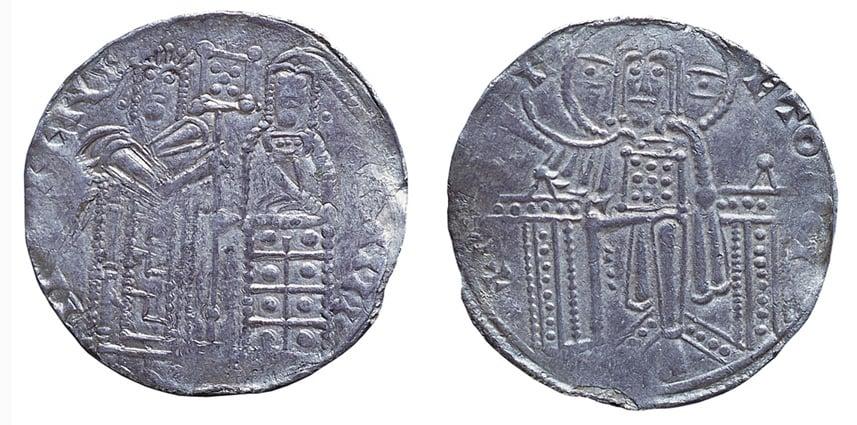 A double penny depicting Christ enthroned on one side and the Archangel Michael and the emperor on the other.