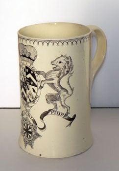 Cylindrical tankard with splayed foot, ear-shaped strap-handle, in thinly potted yellow creamware. Decorated with the arms of Charles 2nd Marquis of Rockingham and the badge of the Grenadiers, the 1st Regiment of Foot in black enamel lines and shading as on an engraving.